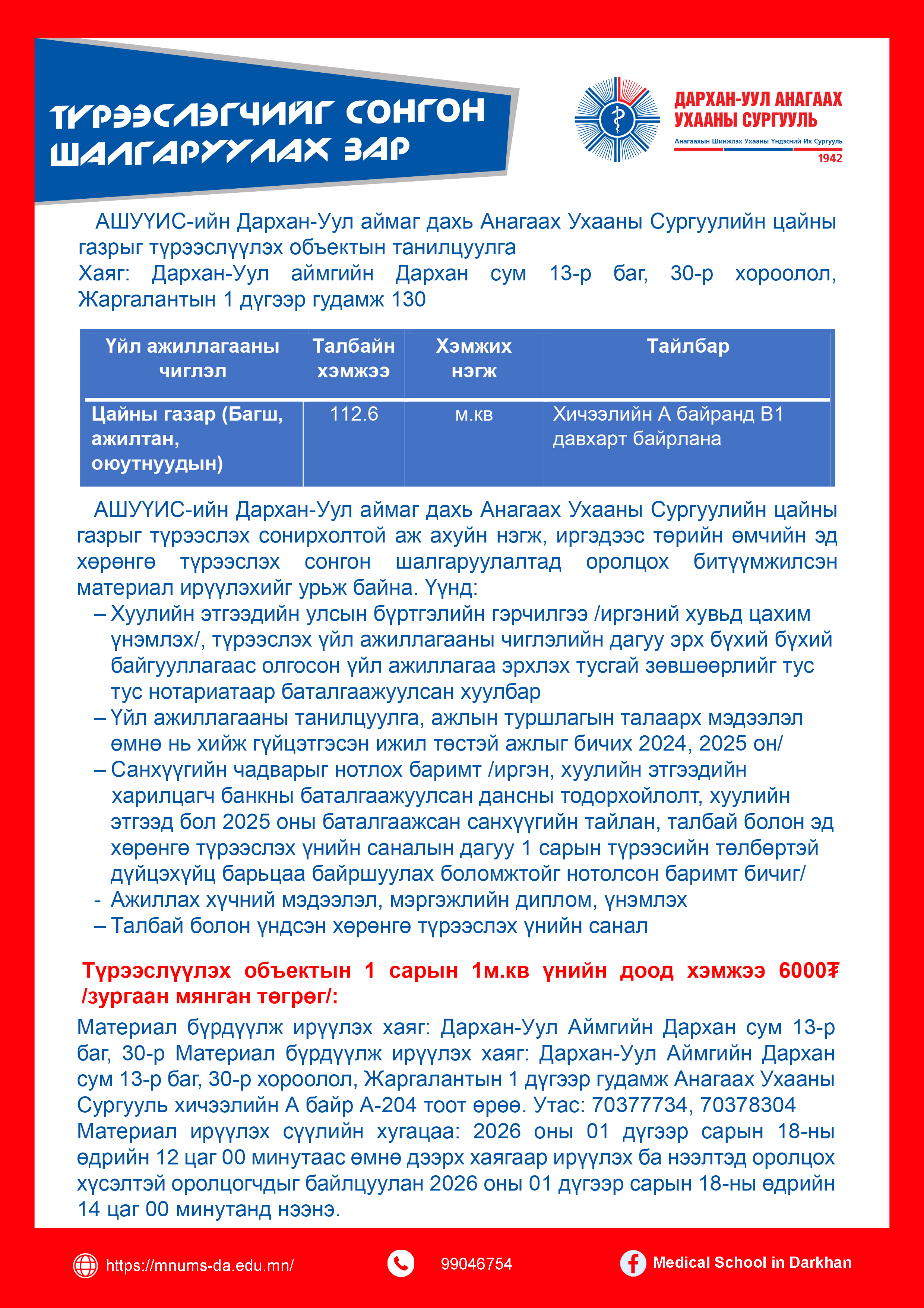 Сургалтын орчин, эмнэлэг, дотуур байр